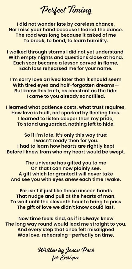 A poem I wrote for the love of my life about how sometimes we find the one we’ve always been searching for later in life because there are things we must go through and learn before we can truly appreciate what we have.